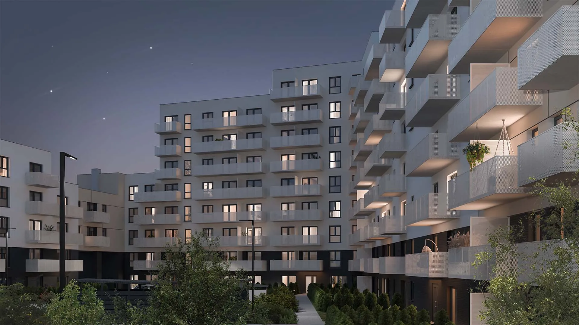 - The high-quality of finishing of the buildings’ common areas is characterised by decorative laminated furniture panels, durable stoneware with a delicate and toned-down design, premium mosaic plaster and energy-saving LED light fixtures. The entrance halls also feature large mirrors and aesthetic stainless mailboxes.