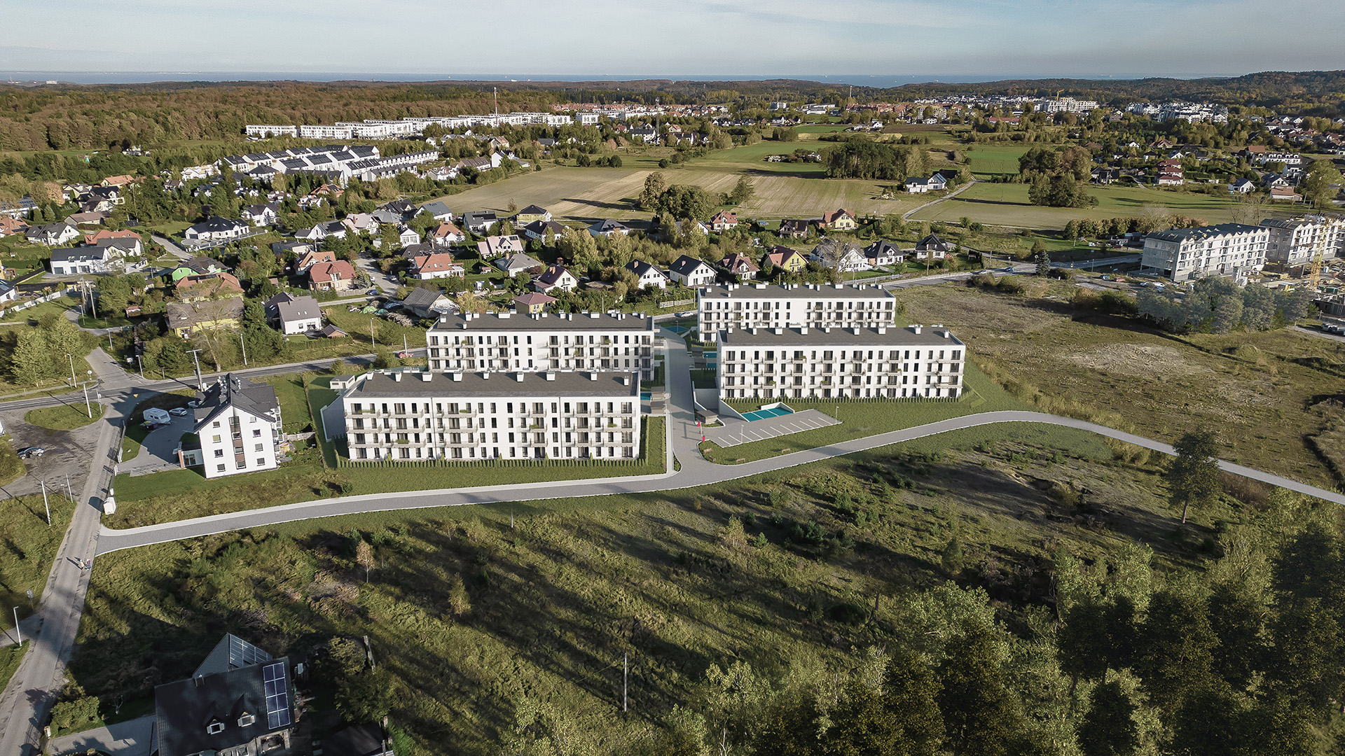 - Osiedle jest świetnie zlokalizowane pod względem komunikacyjnym, ponieważ w zaledwie 7 min samochodem można dotrzeć do Obwodnicy Trójmiasta i ekspresowo się przemieszczać po całej aglomeracji. W 10 min zaś można dojechać do Trasy Kaszubskiej.