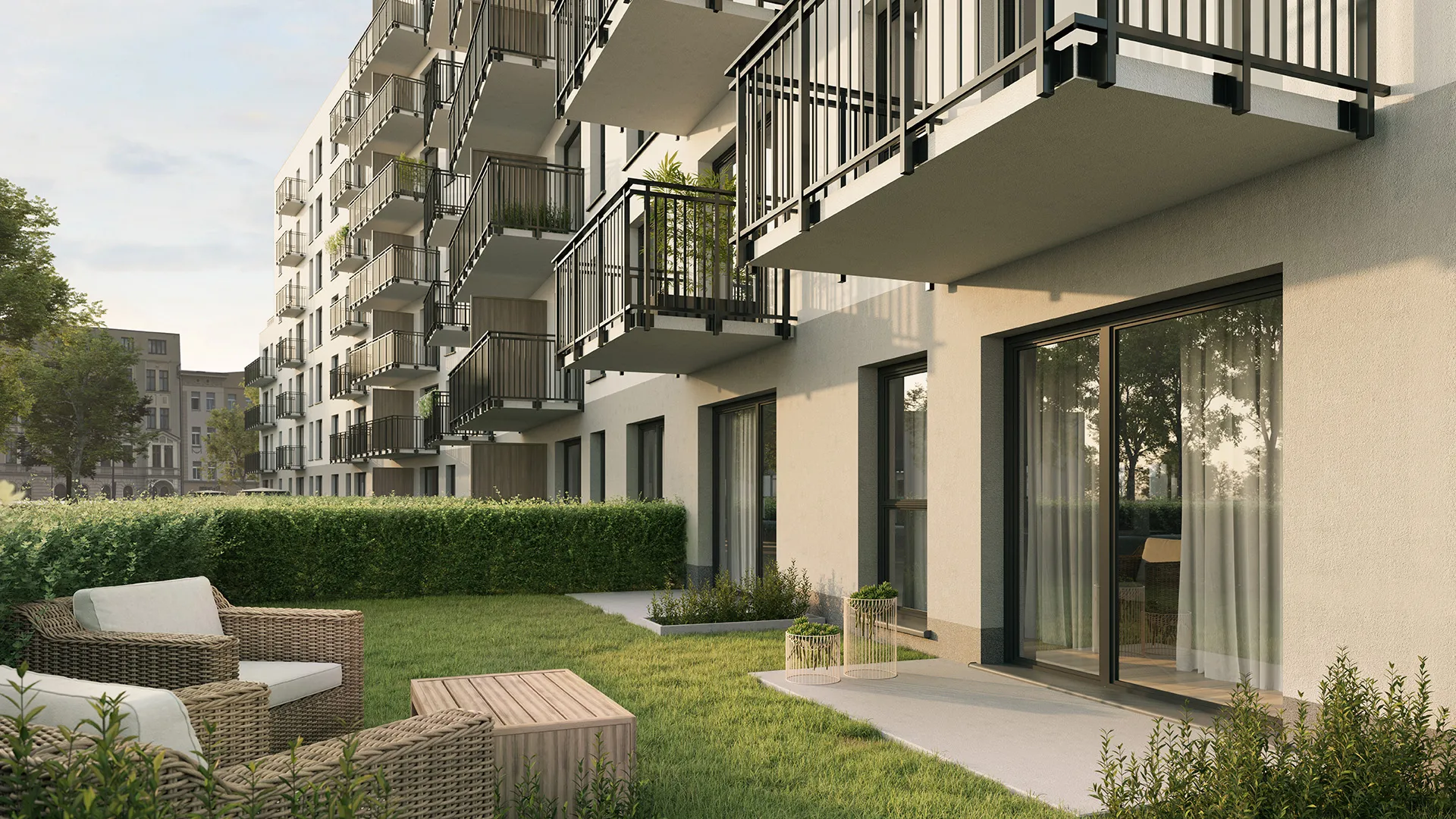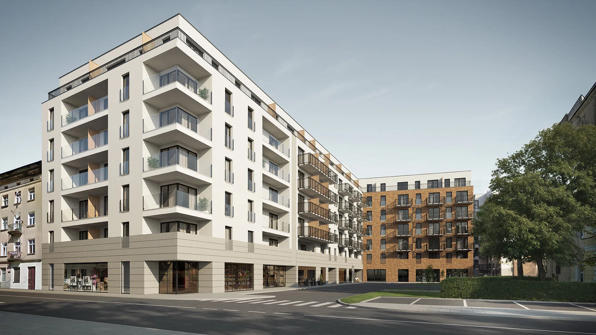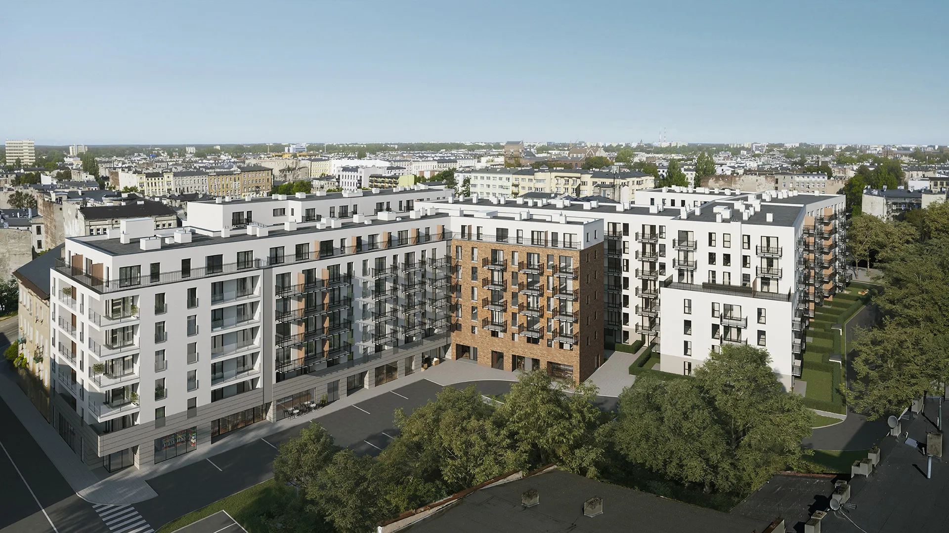 Trzy 6-piętrowe budynki harmonijnie wkomponowane w kwartał śródmieścia.